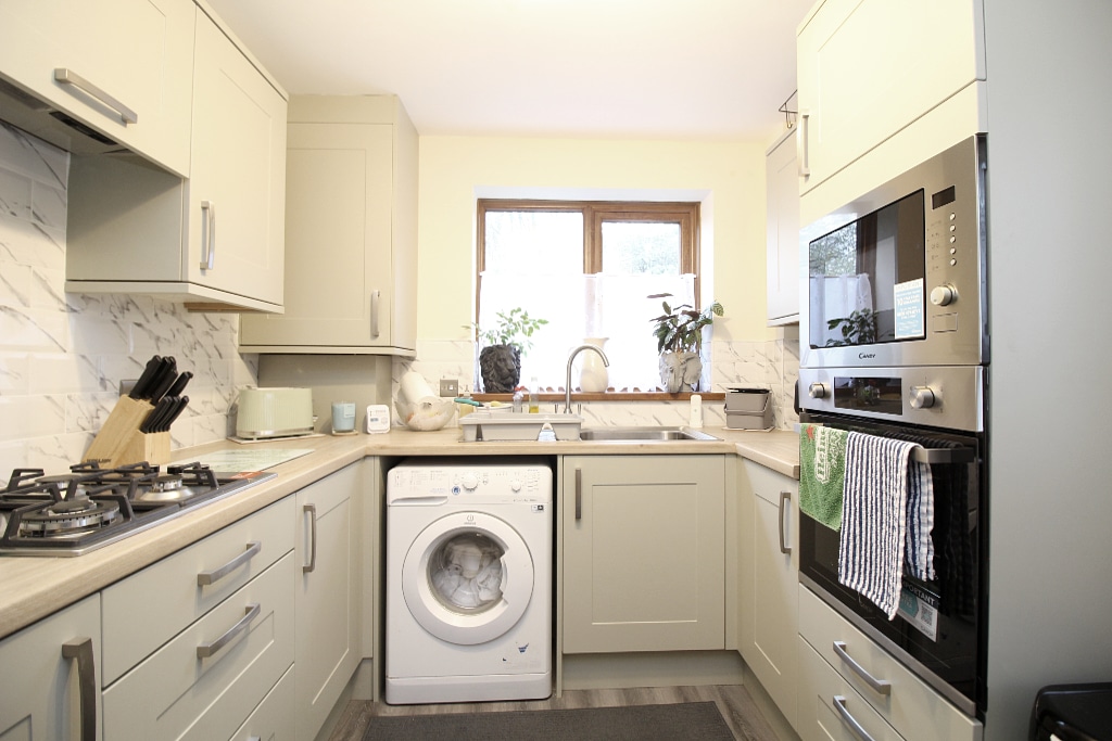 UPVC double glazed window and door to rear, plastered walls, textured ceiling, laminate flooring, vertical radiator, wall and base units with laminate work tops and tiled splash backs, stainless steel sink unit with mixer tap, integrated fridge/freezer, microwave, oven and gas hob with over head extractor fan, door to under stairs storage.