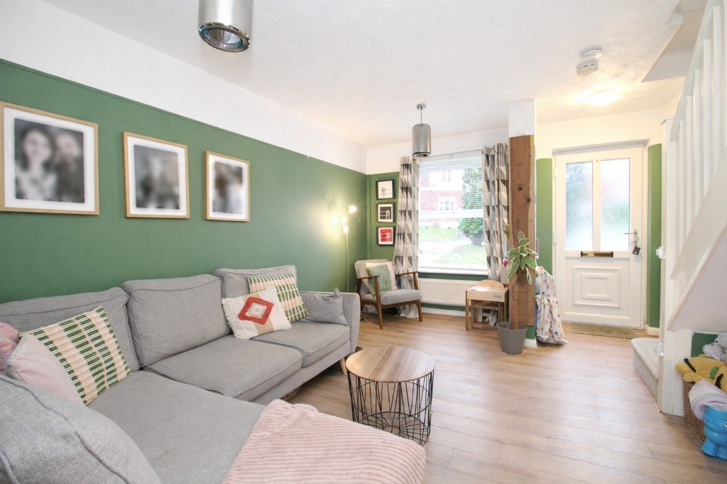 UPVC double glazed window to front, plastered walls, textured ceiling, laminate flooring, radiator, doors to kitchen/diner and fitted storage, stairs to first floor landing.