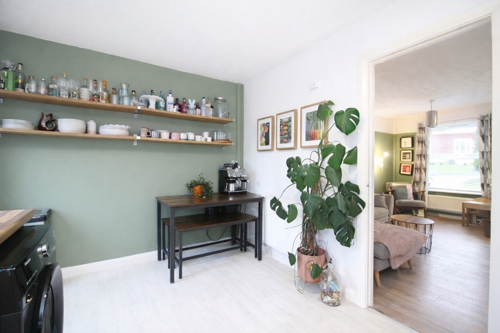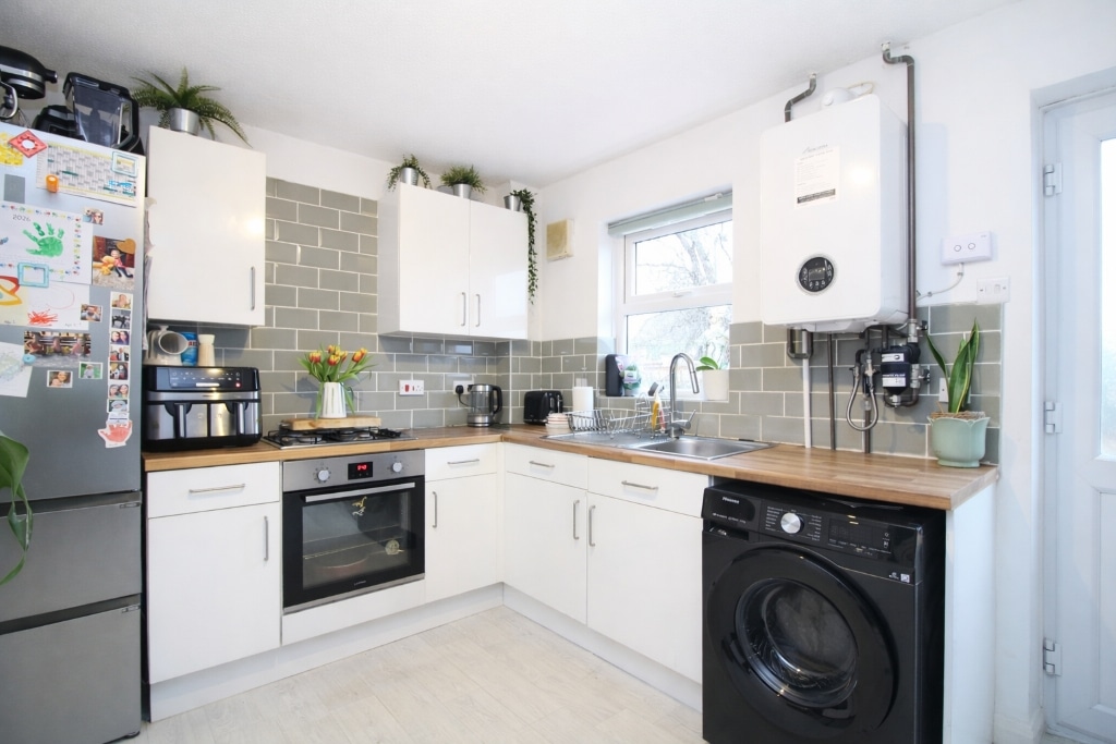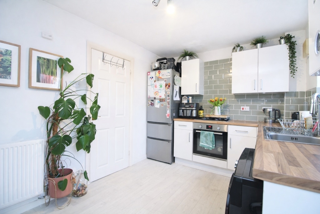 UPVC double glazed window and door to rear garden, plastered walls, textured ceiling, vinyl flooring, radiator, wall and base units with laminate work tops and tiled splash backs, stainless steel sink unit with mixer tap, integrated oven and gas hob with over head extractor hood, space for washing machine, fridge/freezer and dining table, wall mounted combi boiler.