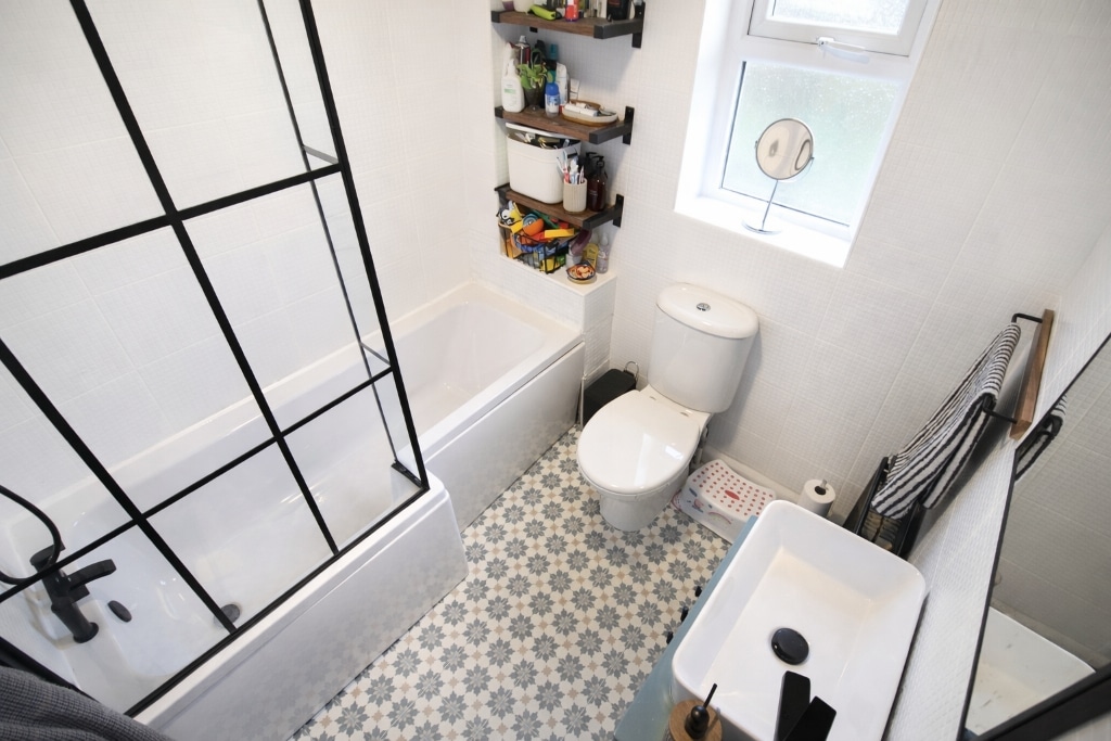UPVC double glazed window to rear, tiled walls, textured ceiling, vinyl flooring, radiator, W.C, wash hand basin, panelled bath with over head shower and glass side screen.