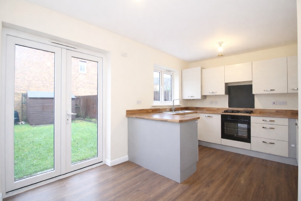 UPVC double glazed window and patio doors to rear garden, plastered walls and ceiling, laminate flooring, radiator, wall and base units with laminate roll top work surfaces, stainless steel sink unit with mixer tap, integrated appliances include fridge/freezer, washing machine, dishwasher and oven with gas hob and over head extractor hood.