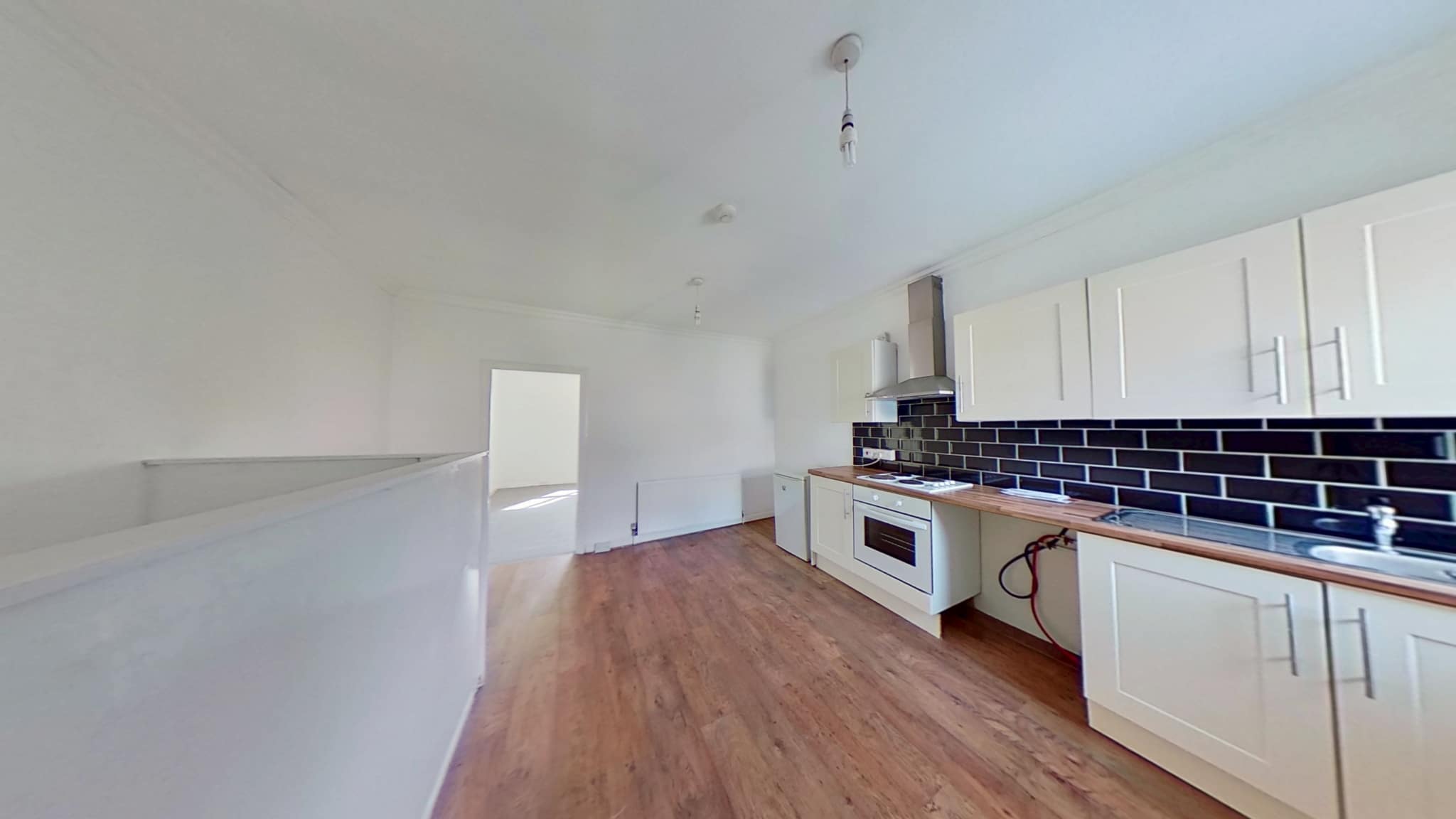 UPVC double glazed window to rear, plastered walls and ceiling, laminate flooring, radiator, wall and base units with laminate work tops, stainless steel sink unit, integrated oven and hob with over head extractor hood, doors to bathroom and bedroom.