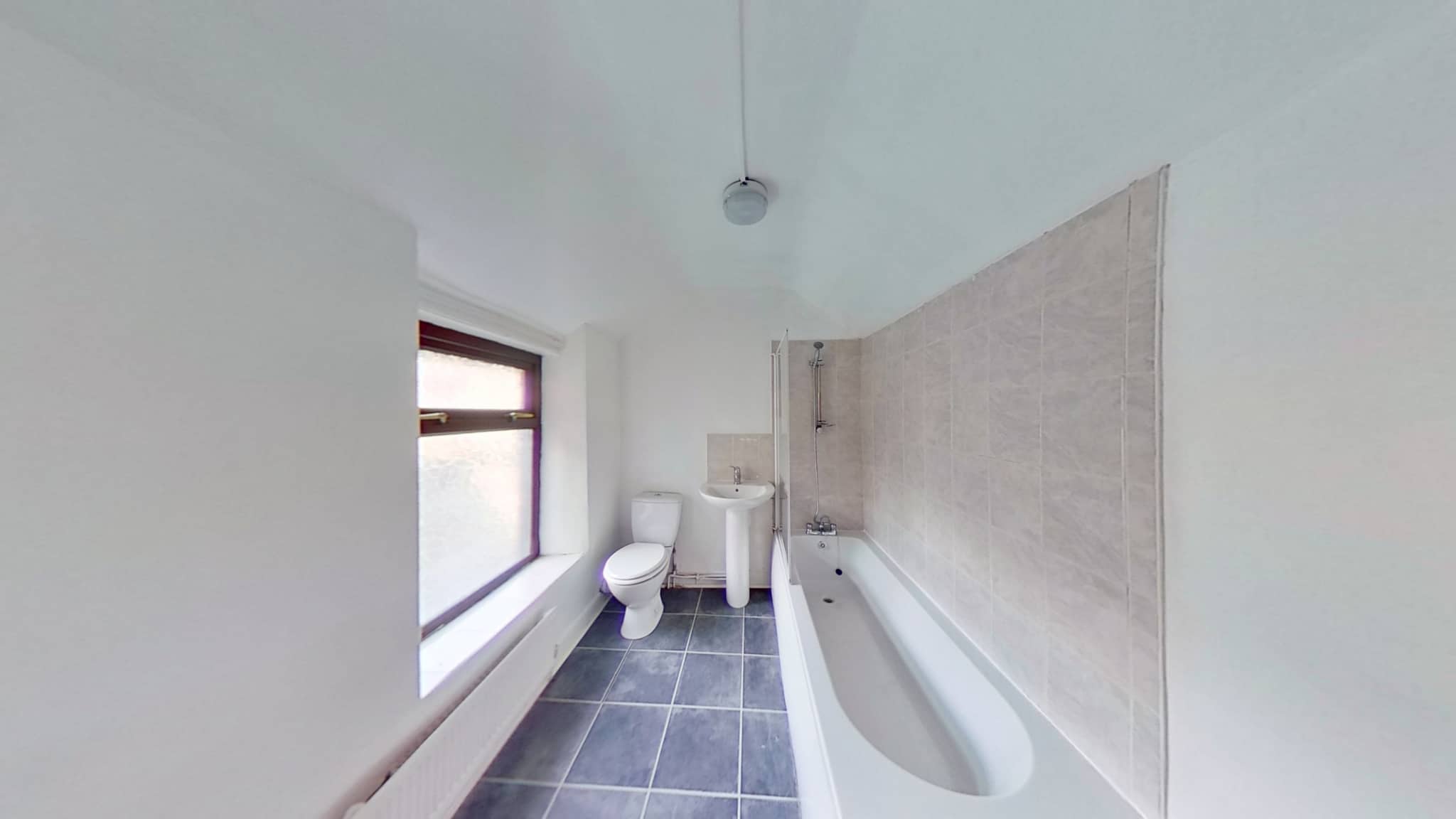 UPVC double glazed window to side, plastered and tiled walls, plastered ceiling, vinyl flooring, radiator, W.C, wash hand basin, panelled bath with over head shower and glass side screen.