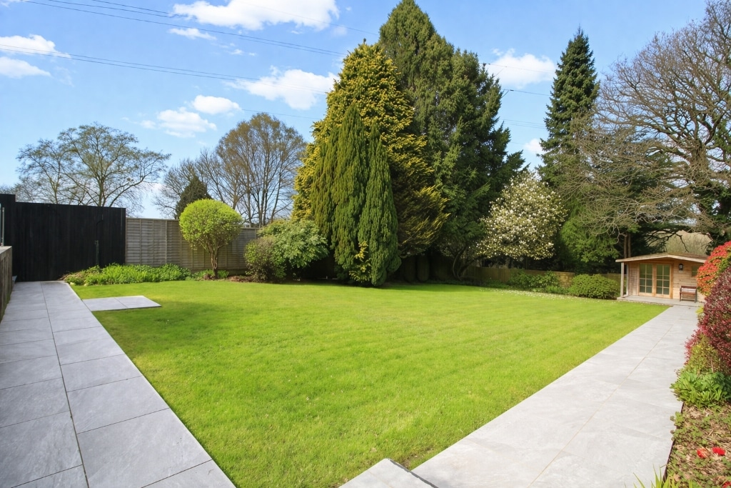 Externally, the property continues to impress. To the front, a block paved driveway provides off-road parking for multiple vehicles and leads to a garage, while the low-maintenance front garden is laid with artificial turf. To the rear, the property enjoys a spectacularly sized and private garden, predominantly laid to lawn and enhanced by a variety of mature plants and trees. A standout feature is the elevated patio area with contemporary glass balustrades, offering stunning views - perfect for relaxing or entertaining. At the foot of the garden, a sizeable summer house provides additional versatile space, offering potential for a home office, studio, or leisure retreat.
