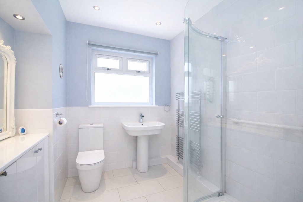 UPVC double glazed window to side, plastered and tiled walls, plastered ceiling, tiled flooring, towel rail radiator, W.C, wash hand basin, shower cubicle.