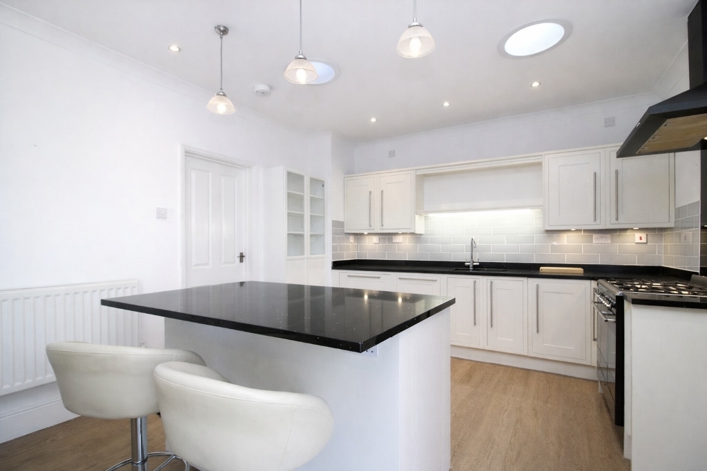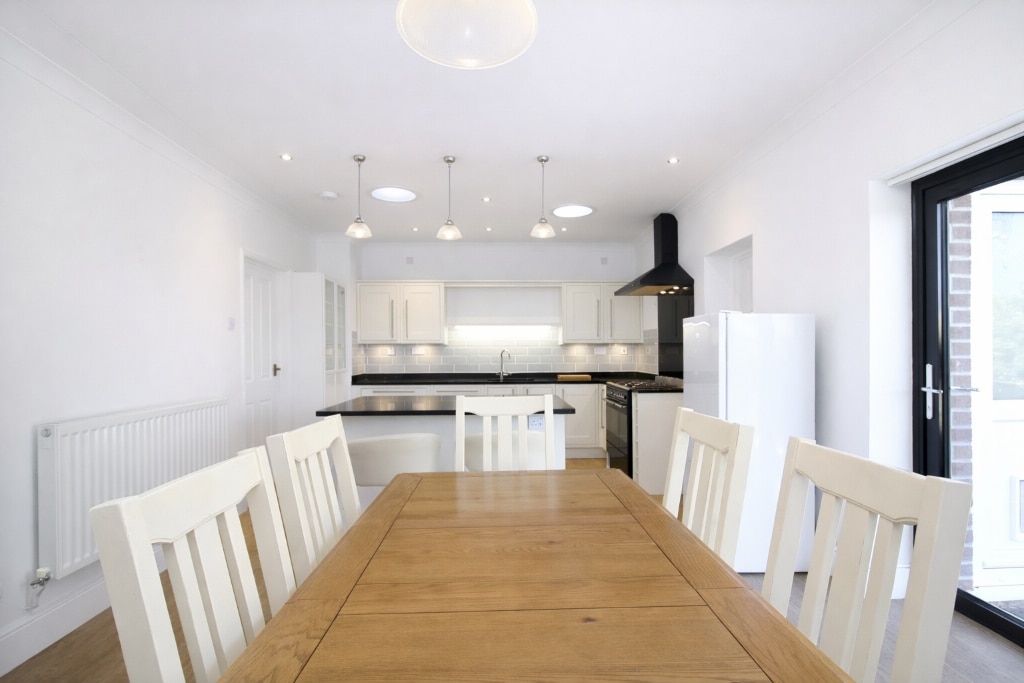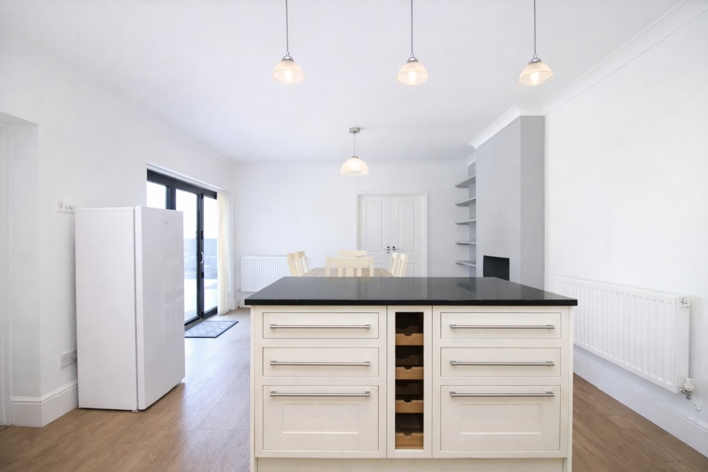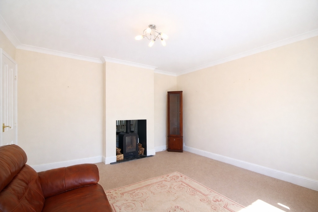 UPVC double glazed bi-folding doors to rear garden, plastered walls and ceiling, laminate flooring, radiator, log burner, wall and base units with granite work tops and tiled splash backs, inset sink unit with mixer tap, integrated dishwasher, doors to utility room and bedrooms three.