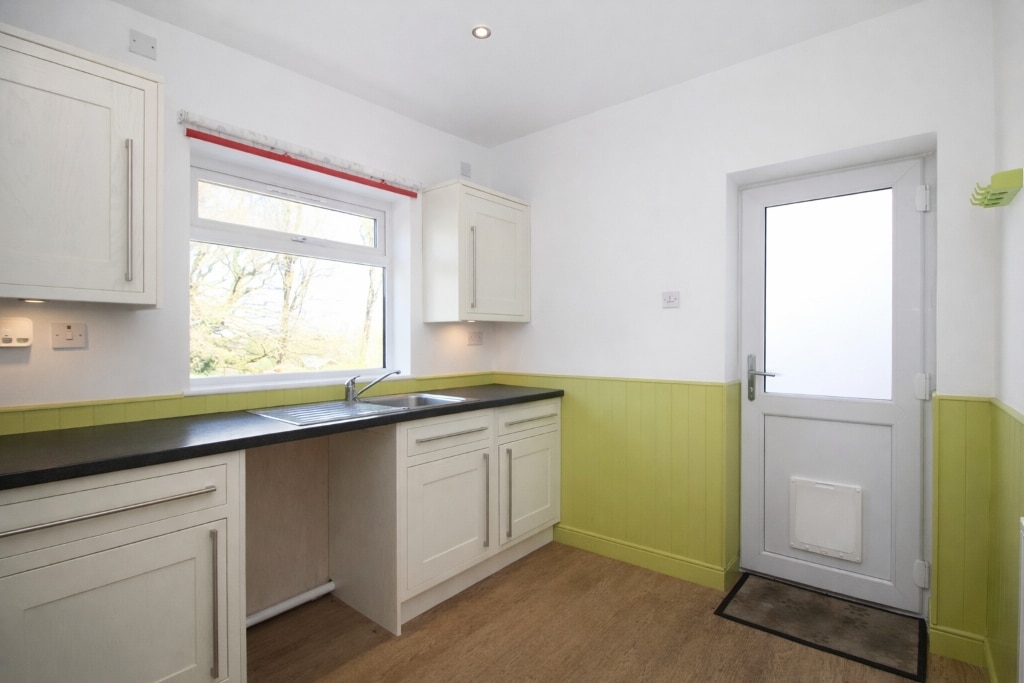UPVC double glazed window and door to rear garden, plastered and wood panelled walls, plastered ceiling, laminate flooring, stainless steel sink unit with mixer tap, wall and base units with laminate work tops, door to W.C.