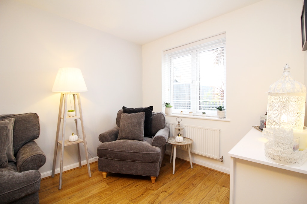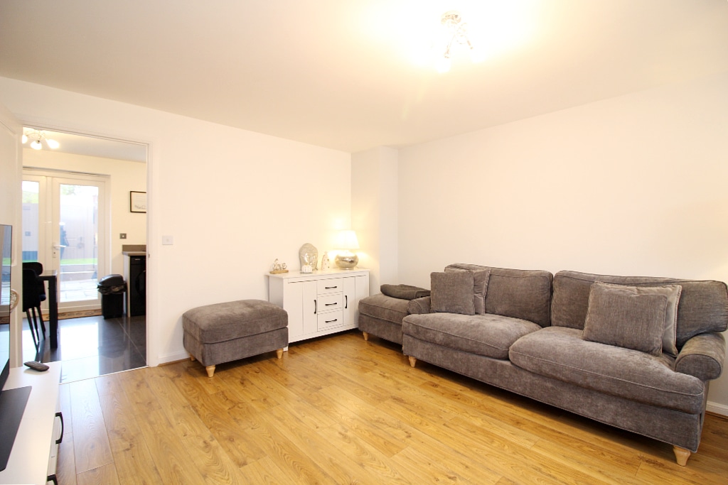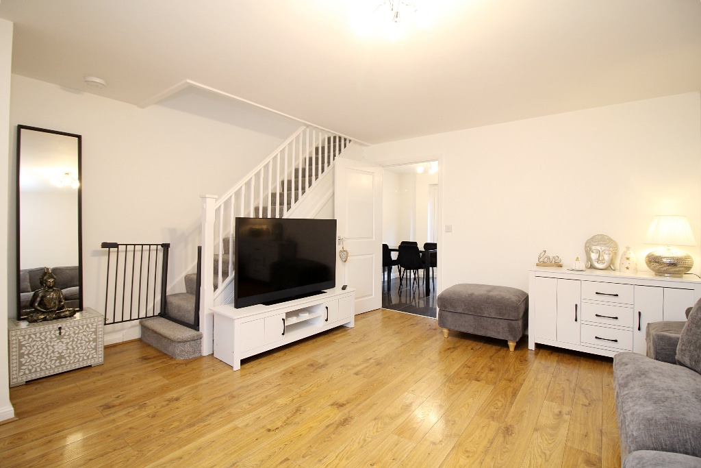 UPVC double glazed window to front, plastered walls and ceiling, laminate flooring, radiator, door to kitchen/diner, stairs to first floor landing.