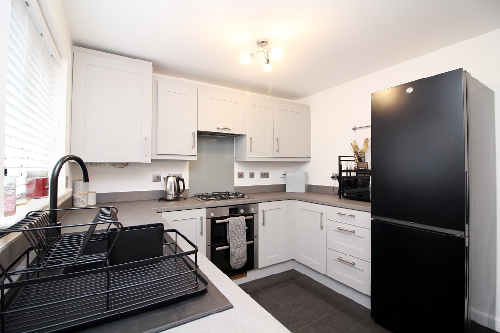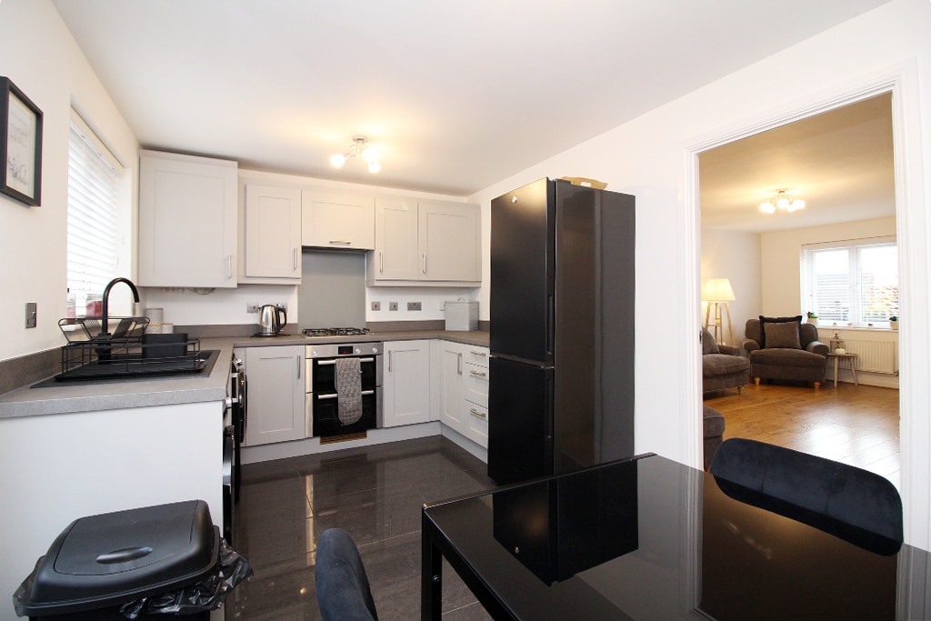 UPVC double glazed window and patio doors to rear, plastered walls and ceiling, tiled flooring, radiator, wall and base units with laminate roll top work surfaces, stainless steel sink unit with mixer tap, integrated oven and gas hob with over head extractor fan, door to under stairs storage.
