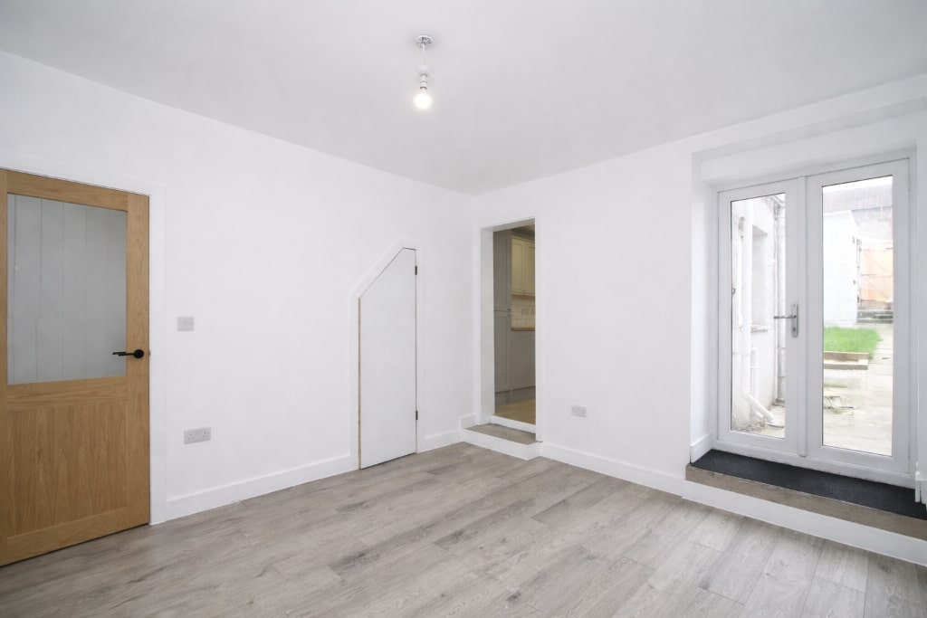 UPVC double glazed doors to rear garden, plastered walls and ceiling, laminate flooring, radiator, door to under stairs storage, opening to kitchen.