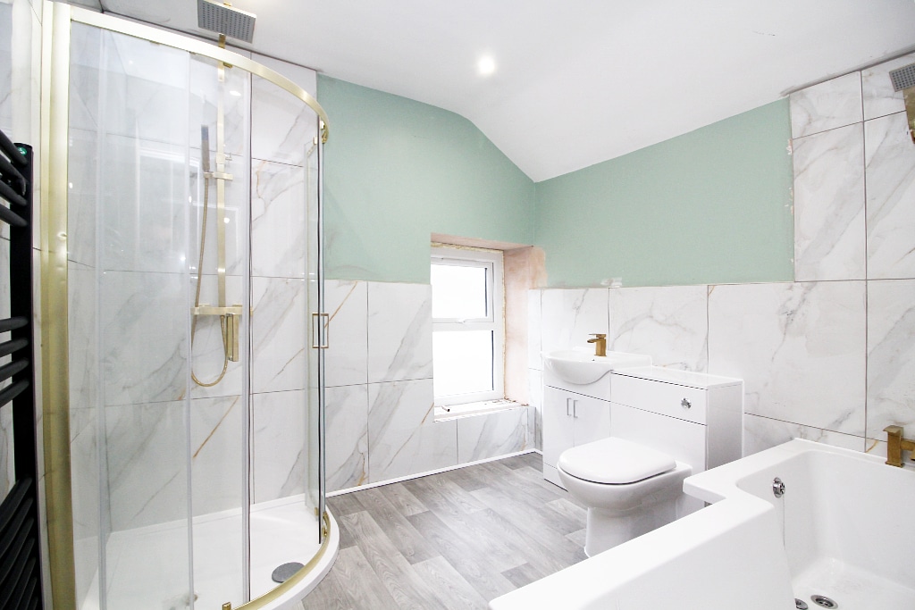 UPVC double glazed window to rear, plastered and tiled walls, plastered ceiling, tiled flooring, radiator, W.C, wash hand basin, shower cubicle, panelled bath with over head shower.