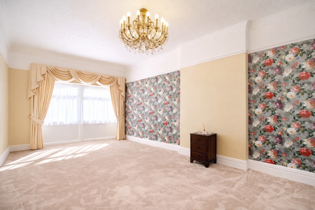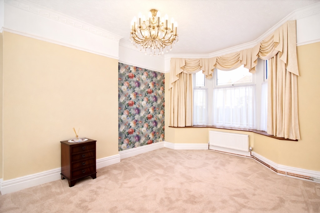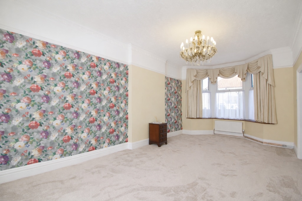UPVC double glazed bay window to front, papered walls, textured ceiling, carpet flooring, radiator.