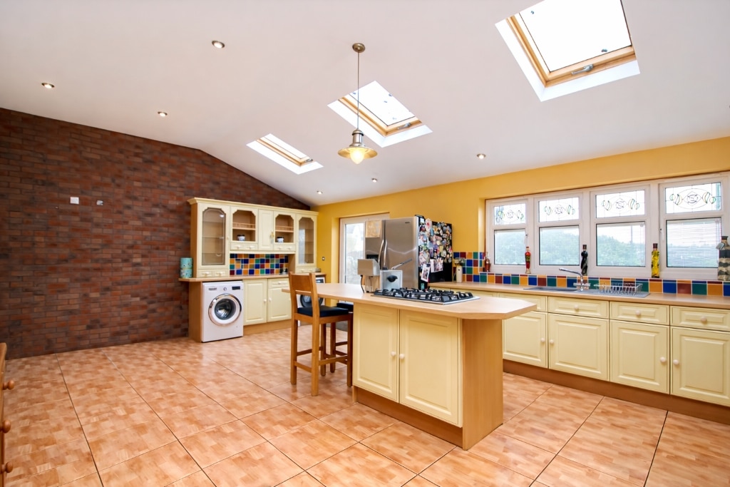 UPVC double glazed windows to side and rear, UPVC double glazed doors to rear, plastered walls and ceiling, tiled flooring, radiators, centre island with base units and laminate roll top work surfaces, wall and base units with laminate work tops with tiled splash backs, sink unit with mixer tap, integrated double oven and gas hob, opening to office room, doors to integral garage and lobby area which leads to downstairs W.C.