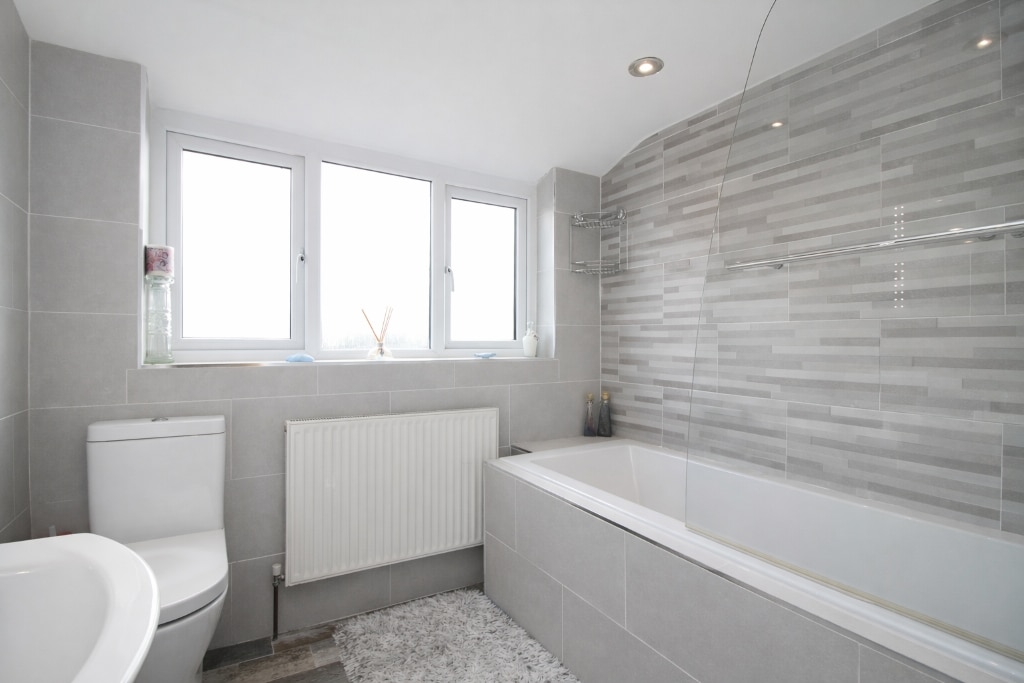 UPVC double glazed window to rear, tiled walls and flooring, plastered ceiling, chrome towel rail radiator, radiator, W.C, vanity wash hand basin, tiled bath with over head shower and glass side screen.