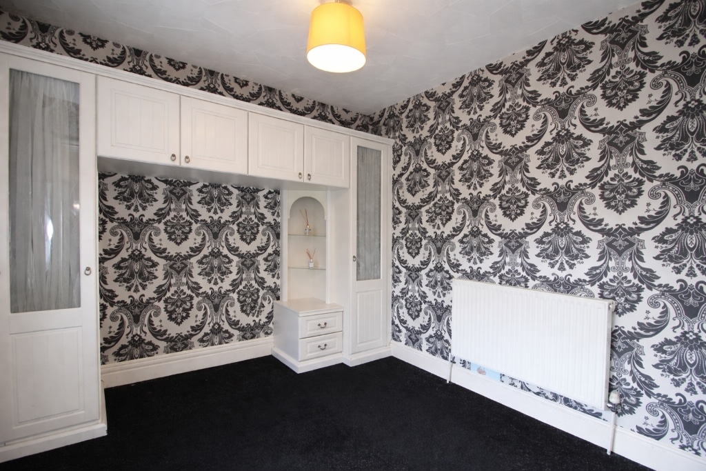 UPVC double glazed window to rear, papered walls, textured ceiling, carpet flooring, radiator, doors to fitted storage.