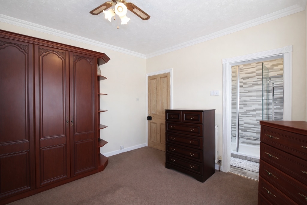 UPVC double glazed bay window to front, papered walls, textured ceiling, carpet flooring, radiator, opening to en-suite shower room.