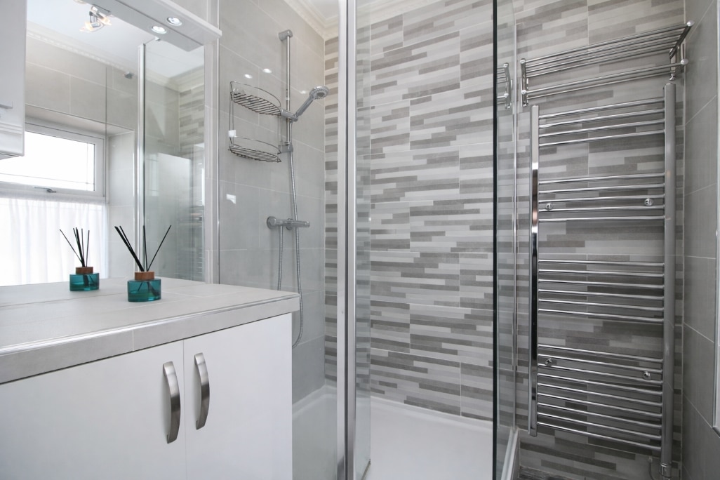 UPVC double glazed window to front, tiled walls and flooring, plastered ceiling, chrome towel rail radiator, vanity storage unit with electric shaving point, walk in shower cubicle.