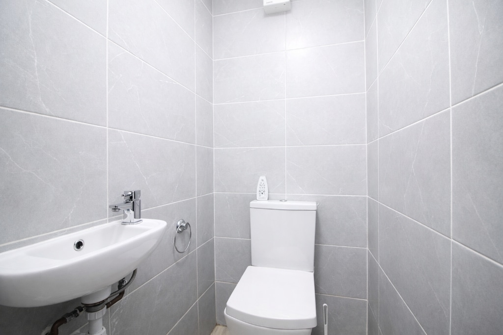 Tiled walls, plastered ceiling, vinyl flooring, W.C, wash hand basin.