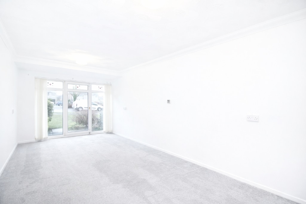 UPVC double glazed window and door to front, papered walls, textured ceiling, carpet flooring, radiator, door to built in storage.