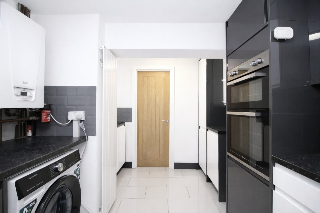 UPVC double glazed window to side, plastered walls and ceiling, tiled flooring, radiator, wall and base units with laminate work tops and tiled splash backs, integrated double oven and gas hob with over head extractor hood, sink unit with mixer tap, door to W.C.