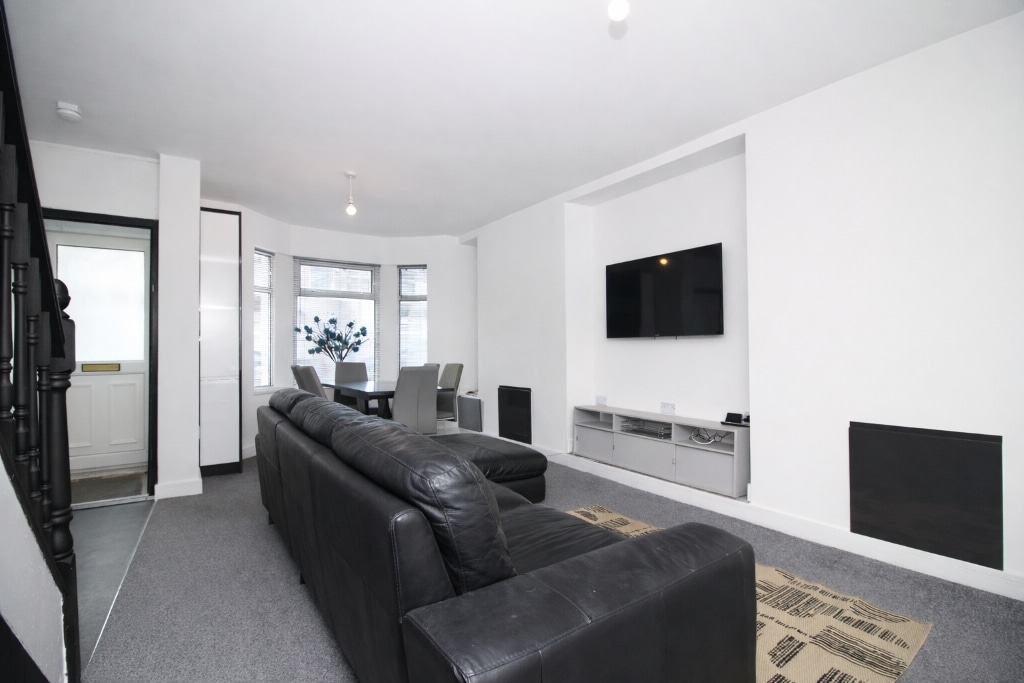UPVC double glazed bay window to front, plastered walls and ceiling, carpet flooring, radiator, UPVC double glazed door to rear garden, stairs to first floor landing, opening to kitchen.