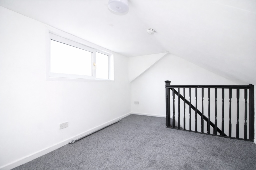 Plastered walls and ceiling, carpet flooring, doors to three bedrooms, stairs to loft.