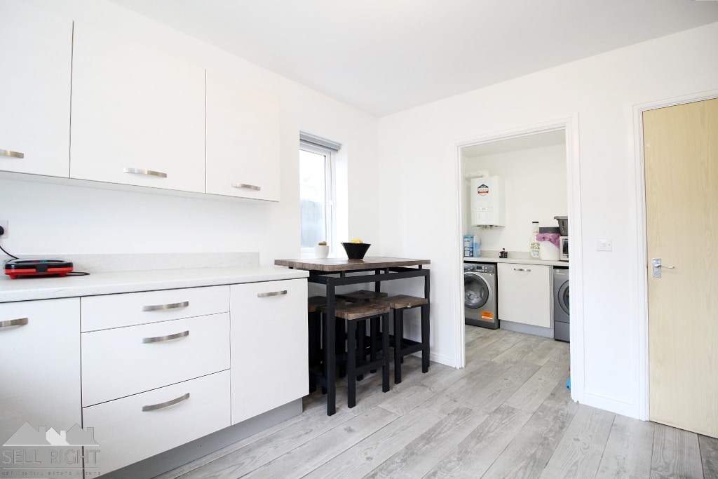 UPVC double glazed window to rear, plastered walls and ceiling, tiled flooring, radiator, wall and base units with laminate work tops, stainless steel sink unit with mixer tap, integrated oven and gas hob with over head extractor fan, opening to utility room.