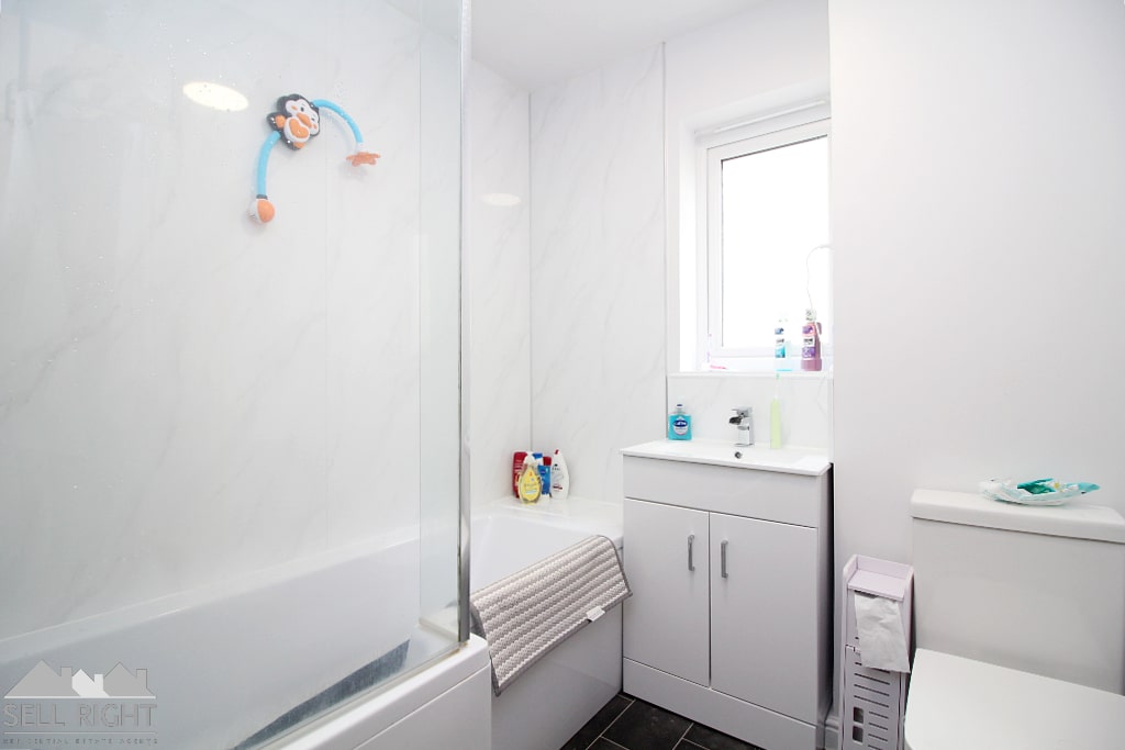 UPVC double glazed window to side, plastered and pvc panelled walls, plastered ceiling, vinyl flooring, radiator, W.C, vanity wash hand basin, panelled bath with over head shower and glass side screen.