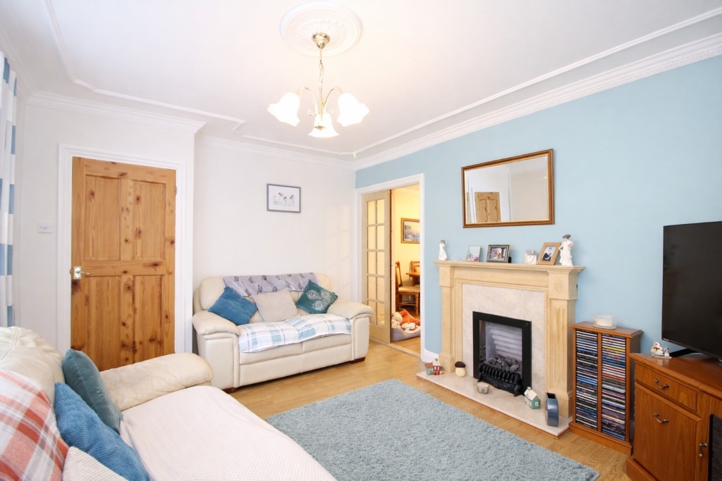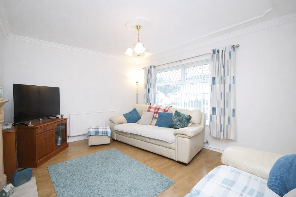 UPVC double glazed window to front, plastered walls, papered ceiling, laminate flooring, radiator, doors to kitchen/diner.