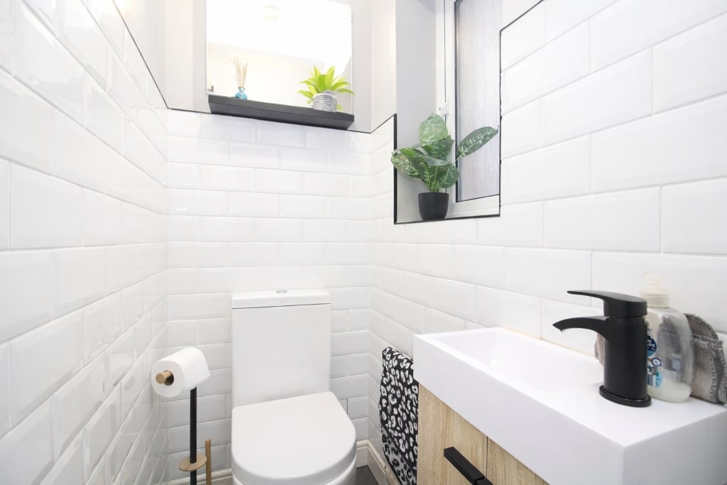 UPVC double glazed window to side, plastered and tiled walls, textured ceiling, tiled flooring, W.C, vanity wash hand basin with mixer tap.