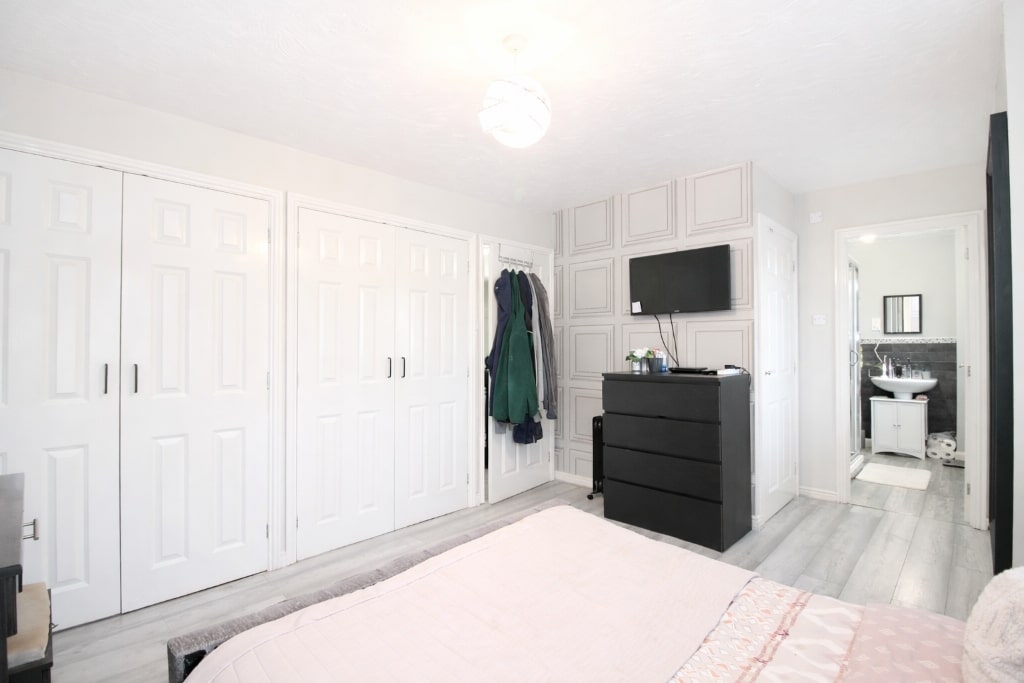 UPVC double glazed windows to front, plastered and papered walls, textured ceiling, laminate flooring, radiator, doors to fitted wardrobes, storage cupboard and utility room.