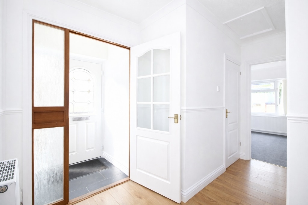 Plastered walls, textured ceiling, laminate flooring, radiator, doors to shower room, kitchen, lounge and two bedrooms.